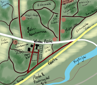 – Käännymme polulle. Ohitamme Ykssilimääsenmäen, Pihlajamäen ja Jätinkissankiven. Halukkaat voivat kiivetä Pihlajamäelle, joka on nimensä mukaisesti pikkuinen mäennyppylä, jossa kasvaa pihlajapuita ja jossa on vanhan mökin kiviperustan rauniot. Jätinkissankivellä asuu kettuperhe, josta kivi saa nimensä: toivottavasti näemme emon! Tämä pätkä on metsäisin ja tässä saattaa olla itikoita. Poluilla voi ravailla hiljaa, mutta mennään suurimmaksi osaksi käynnissä.